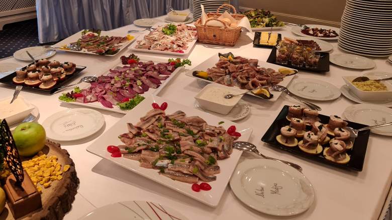 Zum Glückstädter Matjesbuffet wird satt serviert: Matjesfilet-Variationen (Natur, Rotweinfilets,